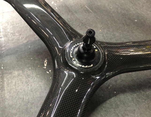 Full carbon three spoke front wheel with NACA profile spokes