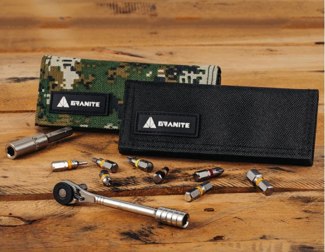 RocknRoll Mini Ratchet Tool Kit is housed in a durable tool roll crafted from high-strength 600D fabric, known for its abrasion resistance. This comprehensive kit includes a mini ratchet wrench, 9 CNC machined bits, and an extension rod, all organized for easy access.