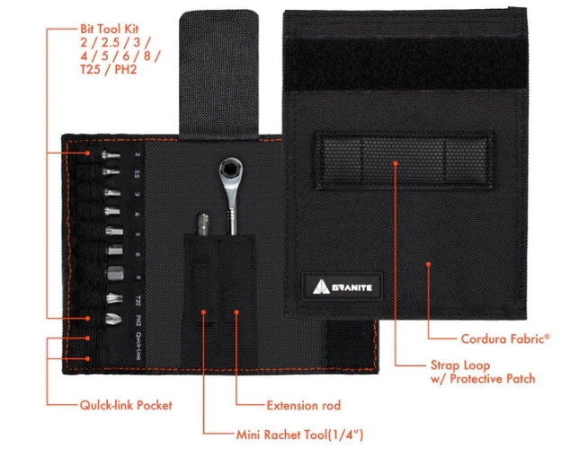 Additionally, the roll features small pockets specifically designed for storing quick-links. Equipped with a specialized loop strap and a protective patch, the tool roll integrates seamlessly with the Granite Rockband carrier strap, ensuring both portability and accessibility on your rides.